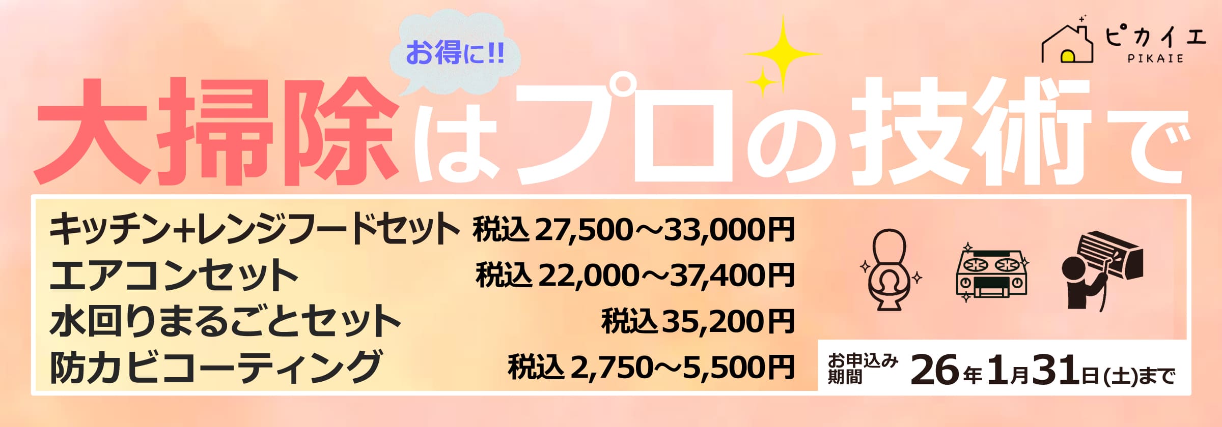 長年にわたって、オフィスビルや商業施設の清掃事業を手がけてきた実績を活かして、 手軽な価格でハイクオリティなハウスクリーニングサービスを実現しました。 溜まったしつこい汚れやカビもすっきり落として、 快適な空間を生み出すプロの技術を、ぜひお試しください。ピカイエを運営するアイング株式会社では、1973年の設立以来これまでに東京ドーム100個分以上におよぶ建築面積の清掃・ビルメンテナンス事業に携わる中で、確かな技術力と専門性に裏打ちされた『安全・安心』のサービスを追求してきました。みなさまへご提供するのは、その中で築いた ノウハウと最高レベルの清掃技術。加えて定期的なスキルアップ研修によって、『ただの掃除屋ではない』ホスピタリティ溢れるスタッフの育成に努めています。